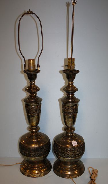 Contemporary Highly Decorated Pair of Brass Table Lamps; 34" h. to finial top Contemporary Highly Decorated Pair of Brass Table Lamps; 34" h. to finial top