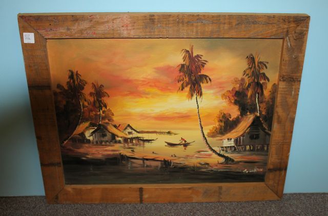Oil Painting of Shacks and Man Fishing; 22" h., 28" w. Oil Painting of Shacks and Man Fishing; 22" h., 28" w.