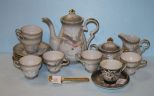 Oriental Tea Set; with teapot 7" h., sugar and creamer 4" h., 6 cups and saucers, one odd cup and saucer, 4 gold spoons Oriental Tea Set; with teapot 7" h., sugar and creamer 4" h., 6 cups and saucers, one odd cup and saucer, 4 gold spoons
