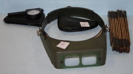 Group of Tools; welding glasses, measuring tape, two survey tools Group of Tools; welding glasses, measuring tape, two survey tools