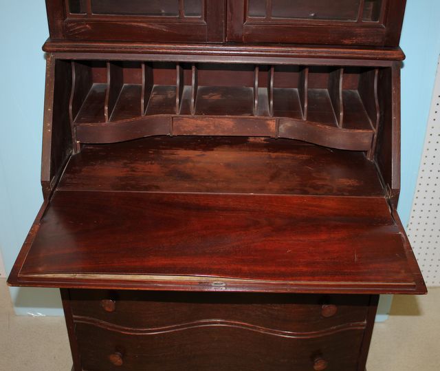 20th Century Mahogany Chippendale Style Fall Front Desk; some veneer on window divider gone, 30" w., 16" d., 76" h. 20th Century Mahogany Chippendale Style Fall Front Desk; some veneer on window divider gone, 30" w., 16" d., 76" h.
