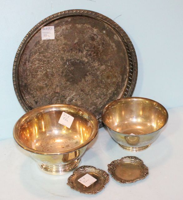 Silverplate Lot; round tray 10"dia., two small butter pats 2 7/8"dia., two bowls 5"dia. Silverplate Lot; round tray 10"dia., two small butter pats 2 7/8"dia., two bowls 5"dia.