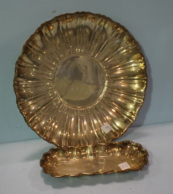 Silverplate Serving Tray 15 1/2"dia., silverplate tray 11 1/2"l. Silverplate Serving Tray 15 1/2"dia., silverplate tray 11 1/2"l.