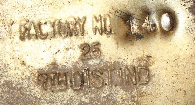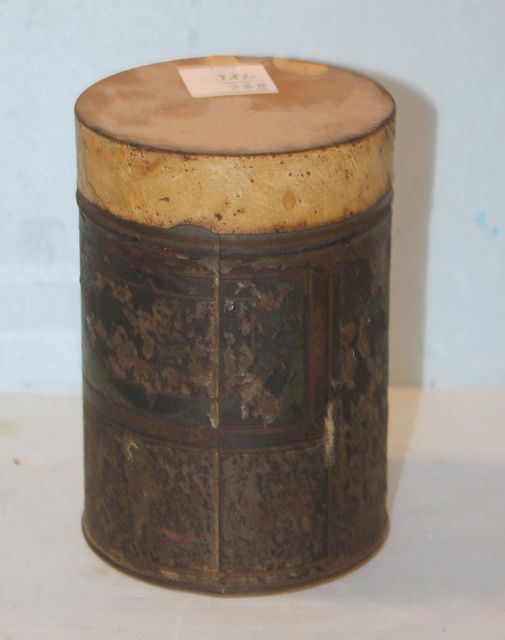 Two Tin Boxes or Cans. One Old Factory number 140, paper cover wearing off; 5 1/2"h., 3 1/2"dia. Two Tin Boxes or Cans. One Old Factory number 140, paper cover wearing off; 5 1/2"h., 3 1/2"dia.