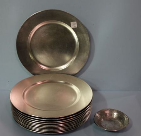 Tag, pewter like bowl 5 1/4"dia., set of 12 plastic silver chargers 13"dia. Tag, pewter like bowl 5 1/4"dia., set of 12 plastic silver chargers 13"dia.