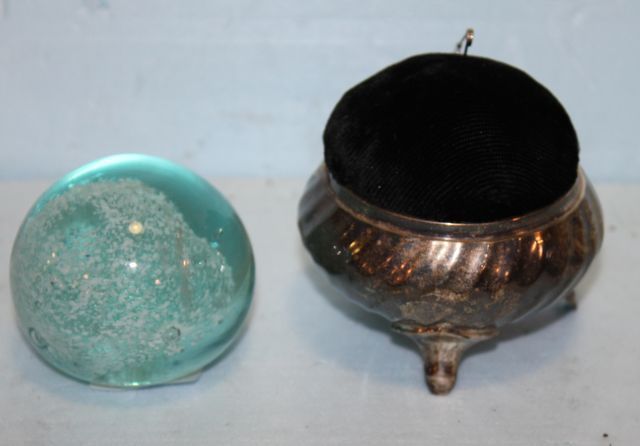 Paperweight 2 1/4"dia., and My Fair Lady 2-26-98 silverplate pin cushion; 3"dia. Paperweight 2 1/4"dia., and My Fair Lady 2-26-98 silverplate pin cushion; 3"dia.