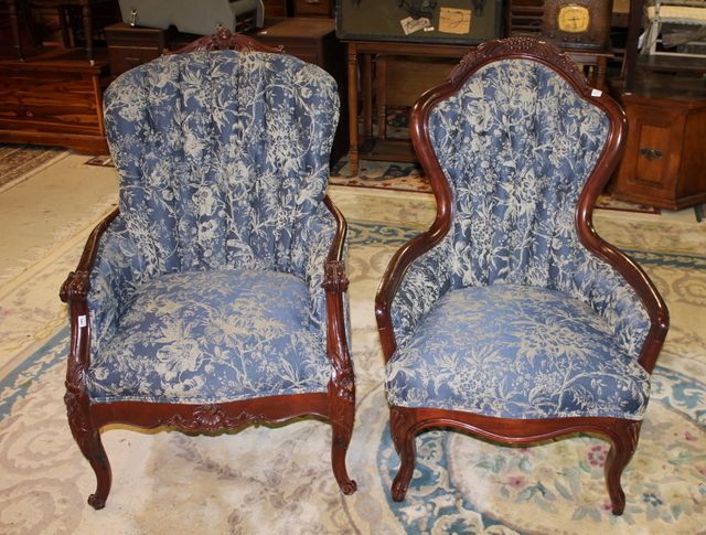 Matching Gents and Lady's Parlor Chairs, on the Gent's front legs have been repaired; 40"h. Matching Gents and Lady's Parlor Chairs, on the Gent's front legs have been repaired; 40"h.