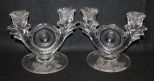 Pair of Etched Two Arm Glass Candlesticks; 5 1/2"h., 8"w. Pair of Etched Two Arm Glass Candlesticks; 5 1/2"h., 8"w.