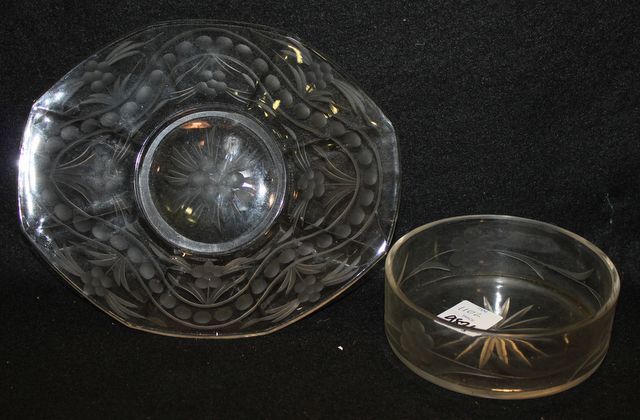 Etched Glass Dish and Underplate; 4 1/2"dia bowl, 7 1/2"w. plate (chipped) Etched Glass Dish and Underplate; 4 1/2"dia bowl, 7 1/2"w. plate (chipped)