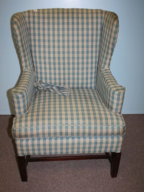 Straight Leg Wing Chair covered in plaid; 27"w., 21"d., 40"h. Straight Leg Wing Chair covered in plaid; 27"w., 21"d., 40"h.