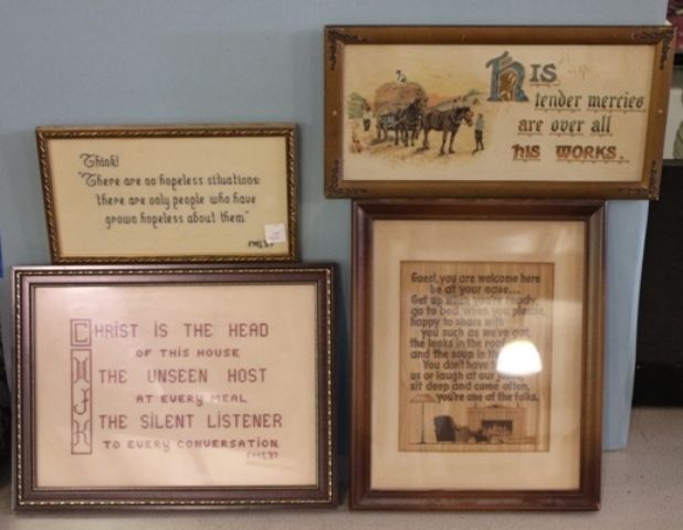 Two framed prints and two needle points. 12 1/2" w by 15" h., 16" w. by 8 1/2" h. and smaller. Two framed prints and two needle points. 12 1/2" w by 15" h., 16" w. by 8 1/2" h. and smaller.