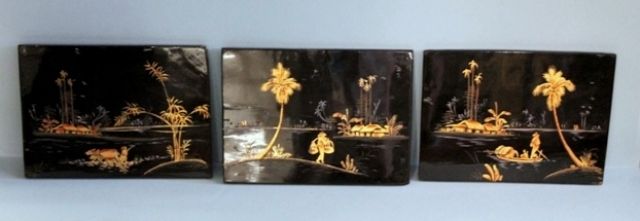 Three Oriental Paintings on Black Lacquer, marked on back made in Vietnam. Each measures 9 1/2" w. by 7" h. Three Oriental Paintings on Black Lacquer, marked on back made in Vietnam. Each measures 9 1/2" w. by 7" h.
