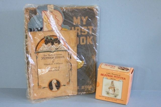 1935 fabric copy of Mother Goose; My First Book, 1936 My Coloring Book Storybook, Paper copy of Mother Goose and group set of Beatrix Potter stories 1935 fabric copy of Mother Goose; My First Book, 1936 My Coloring Book Storybook, Paper copy of Mother Goose and group set of Beatrix Potter stories