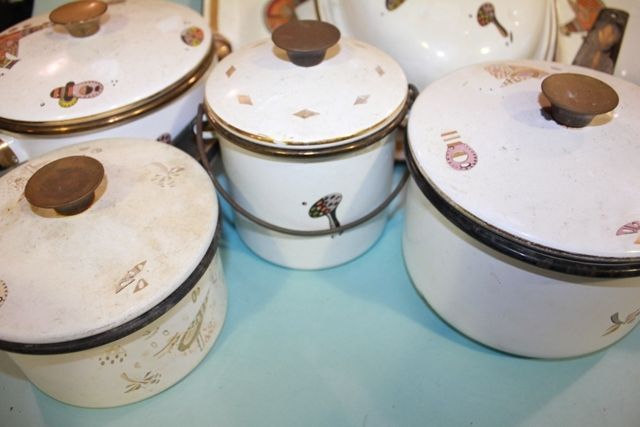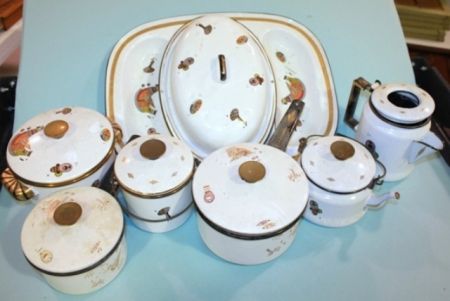 Mid Century Modern Enamel Cookware set signed George Briand Cookware Set including Teapot (missing knob), Pitcher, Four covered pots and one large serving tray with cover. Mid Century Modern Enamel Cookware set signed George Briand Cookware Set including Teapot (missing knob), Pitcher, Four covered pots and one large serving tray with cover.