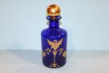Cobalt Blue Container/Perfume with Gold Accent Paint and Gold Stopper. 3 1/2" w. X 7 1/2" h. Cobalt Blue Container/Perfume with Gold Accent Paint and Gold Stopper. 3 1/2" w. X 7 1/2" h.