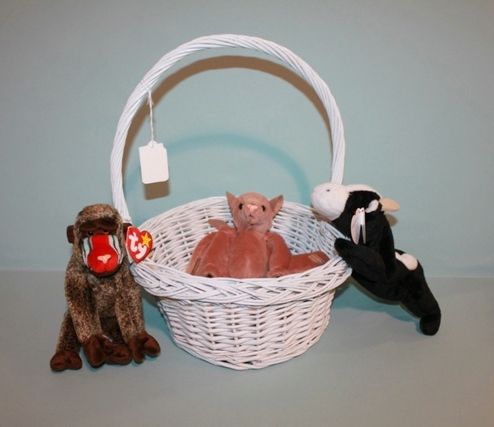 White Wicker Basket and Three Beanie Babies (bat, cow and baboon) White Wicker Basket and Three Beanie Babies (bat, cow and baboon)