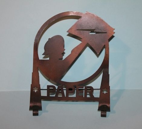 Metal Paper Rack, with image of delivery boy, 9 1/2" w., 12" h. Metal Paper Rack, with image of delivery boy, 9 1/2" w., 12" h.