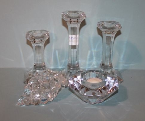 Group of Crystal Candle Holders, three crystal candlesticks in graduating length, and octagonal design votive hold and a grape design votive holder. 6 1/2", 5 1/2" 4 1/2" h. Group of Crystal Candle Holders, three crystal candlesticks in graduating length, and octagonal design votive hold and a grape design votive holder. 6 1/2", 5 1/2" 4 1/2" h.
