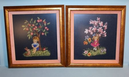 263 Two Framed Tapestry/Needlework of Boy and Girl Sitting Under Trees Description