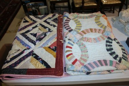Two Hand Made Quilts, full size hand made quilt in double wedding ring pattern, pastel colors and a full size hand made quilt in diamond pattern, earth tone colors Two Hand Made Quilts, full size hand made quilt in double wedding ring pattern, pastel colors and a full size hand made quilt in diamond pattern, earth tone colors