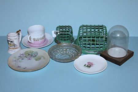 Two Flower Flogs, Glass Dome on Wooden Plateau, Cup and Saucer, Small Mug and Three Dishes Two Flower Flogs, Glass Dome on Wooden Plateau, Cup and Saucer, Small Mug and Three Dishes