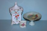 311 Gerold-Porzellan Bavaria, Porcelain Covered Canister; Rosenthal Toothpick Holder, Hand Painted Porcelain Compote Description