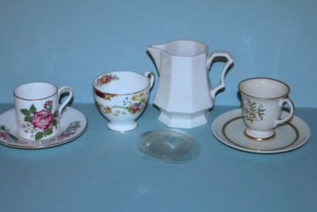 Franciscan china "Fremont" Demitasse Cup and Saucer; Wedgwood Bone China "Charnwood" Demitasse Cup and Saucer, Shelly England "Dubary" Demitasse Cup and Independence Ironstone Creamer. Franciscan china "Fremont" Demitasse Cup and Saucer; Wedgwood Bone China "Charnwood" Demitasse Cup and Saucer, Shelly England "Dubary" Demitasse Cup and Independence Ironstone Creamer.