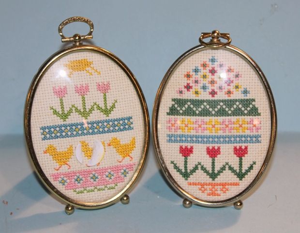 Two Framed Easter Egg Needlepoints. 11" h. Two Framed Easter Egg Needlepoints. 11" h.