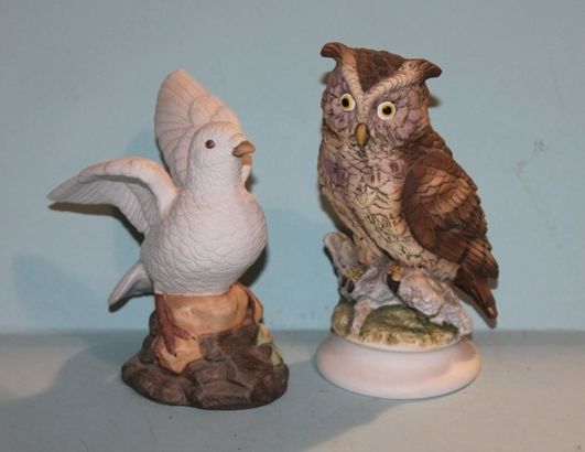 Owl and Bird Figurines, owl by Leftons. 5 1/2" h. and 6 1/2" h. Owl and Bird Figurines, owl by Leftons. 5 1/2" h. and 6 1/2" h.