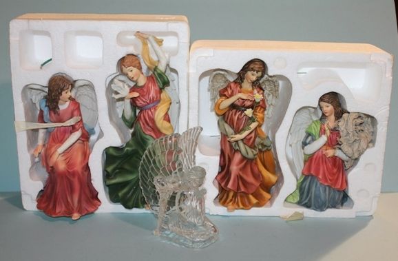 Four Angel Figurines with an Angel Tea Light. Tallest angel is 12" h. Four Angel Figurines with an Angel Tea Light. Tallest angel is 12" h.
