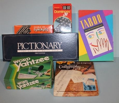 Group of Board Games; Pictionary, Taboo, Word Yahtzee, Two Dominoes and a Calligraphy Set Group of Board Games; Pictionary, Taboo, Word Yahtzee, Two Dominoes and a Calligraphy Set