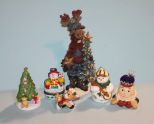 Six Christmas Figurines; Christmas tree, two snowmen, two reindeer and king figurine. 3" to 7" h. Six Christmas Figurines; Christmas tree, two snowmen, two reindeer and king figurine. 3" to 7" h.