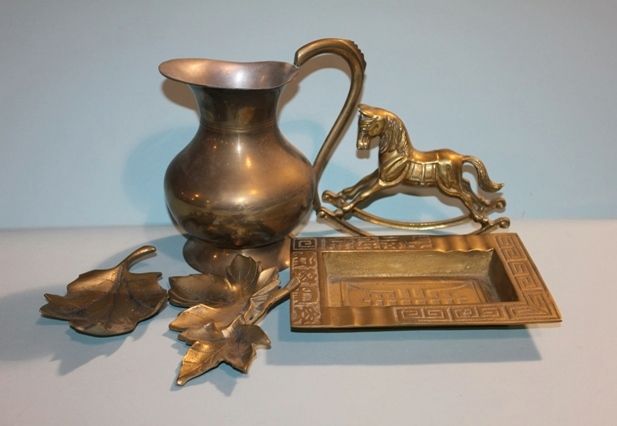 Group of Brass Items; pitcher, rocking horse, leaves and plate. 7 1/2" h. Group of Brass Items; pitcher, rocking horse, leaves and plate. 7 1/2" h.