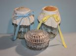 Two Glass Jars with Covered Glass Candy Dish. 5" h. Two Glass Jars with Covered Glass Candy Dish. 5" h.
