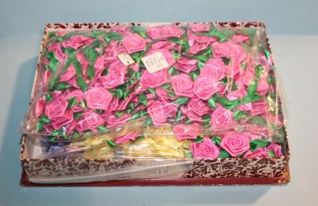 Box of Flowers Made of Ribbon. 11 1/2" w. Box of Flowers Made of Ribbon. 11 1/2" w.