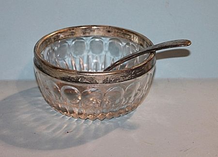 Silverplate Crystal Dish and Spoon. 5" w. x 2 1/2" h. Silverplate Crystal Dish and Spoon. 5" w. x 2 1/2" h.