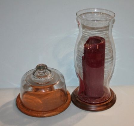 Covered Cake Plate with Glass Dome and Wooden Plateau and Hurricane Shade Candle Holder. 5" h. Covered Cake Plate with Glass Dome and Wooden Plateau and Hurricane Shade Candle Holder. 5" h.
