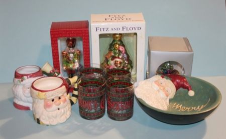 Group of Christmas Dishes and Ornaments; including two Santa mugs, four Christmas glasses, two Fritz and Floyd Ornaments, Santa dish and holiday ornament. 5" h. Group of Christmas Dishes and Ornaments; including two Santa mugs, four Christmas glasses, two Fritz and Floyd Ornaments, Santa dish and holiday ornament. 5" h.