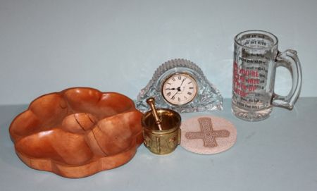 Quartz Clock, Brass Cup, Wooden Dip Plate and Coaster. 2" to 6" h. Quartz Clock, Brass Cup, Wooden Dip Plate and Coaster. 2" to 6" h.
