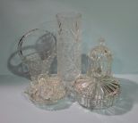 Collection of Pressed Glass Pieces. Vase is 11" h., handled basket is 9"h., covered candy dish 7" dia., covered canister 8" h., small divided dish and 14 various salts. Collection of Pressed Glass Pieces. Vase is 11" h., handled basket is 9"h., covered candy dish 7" dia., covered canister 8" h., small divided dish and 14 various salts.
