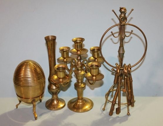 Group of Brass Items; vase, candle holder, keys and key ring, stand and egg. Largest is 10" h. Group of Brass Items; vase, candle holder, keys and key ring, stand and egg. Largest is 10" h.
