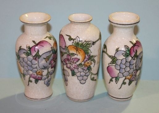 Three Oriental Vases with Fruit Design. 4 1/2" h. Three Oriental Vases with Fruit Design. 4 1/2" h.
