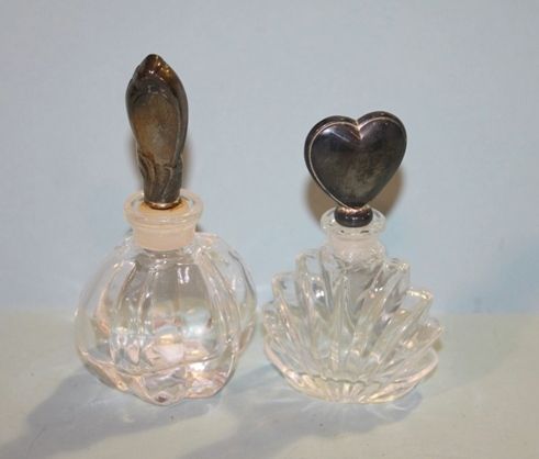 Two glass perfume bottles with silver tone stoppers. 5" h. Two glass perfume bottles with silver tone stoppers. 5" h.