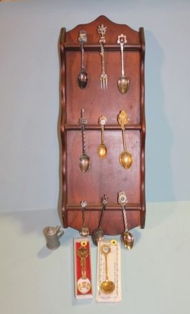Group of 11 Collectible Souvenir Spoons displayed in a wood collector case and a miniature pewter stein. Case is 17" h. x 7" w. Group of 11 Collectible Souvenir Spoons displayed in a wood collector case and a miniature pewter stein. Case is 17" h. x 7" w.