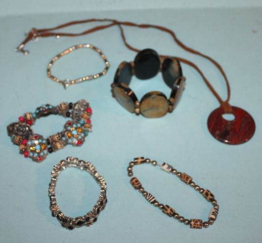 Group of Costume Jewelry, group include 5 bracelets, one necklace and pair of earrings Group of Costume Jewelry, group include 5 bracelets, one necklace and pair of earrings