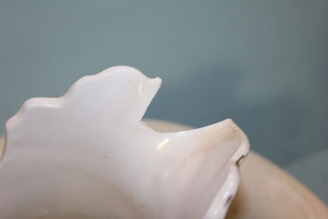 Hand painted pitcher with matching bowl, floral design on white background, damage at mouth of pitcher. Pitcher is 10 1/2" h., bowl is 15" dia. Hand painted pitcher with matching bowl, floral design on white background, damage at mouth of pitcher. Pitcher is 10 1/2" h., bowl is 15" dia.
