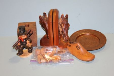 Early Hummel Figurine of boy with ladder marked with a Double Crown on bottom and Group of Miscellaneous Items; wood shoe form, horse head bookends, metal plate, group of oriental mini wood plates, bowls and vase, Early Hummel Figurine of boy with ladder marked with a Double Crown on bottom and Group of Miscellaneous Items; wood shoe form, horse head bookends, metal plate, group of oriental mini wood plates, bowls and vase,