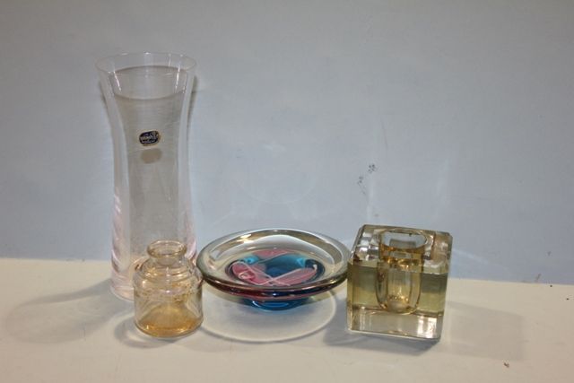 623 Bohemia Vase, Art Glass Bowl and Two Green Glass Pieces Description