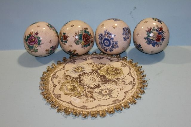 627 Group of Hand Painted Decorative Balls and Fabric Doily Description