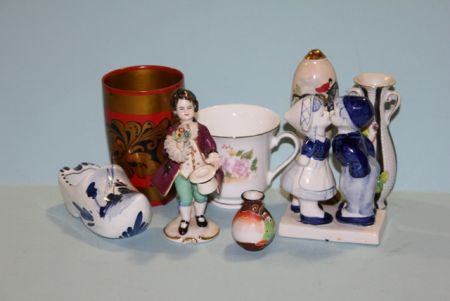 Group of Porcelain items, Dresden figure of boy holding flowers, Delft figurine of boy and girl kissing, Blue and White Delft Dutch shoe, small double handled vase, salt shaker with hand painted jockey and horse marked "Mead", small cup, gold tone plastic tumbler and miniature oriental vase Group of Porcelain items, Dresden figure of boy holding flowers, Delft figurine of boy and girl kissing, Blue and White Delft Dutch shoe, small double handled vase, salt shaker with hand painted jockey and horse marked "Mead", small cup, gold tone plastic tumbler and miniature oriental vase